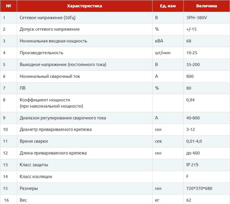 - максимальный диаметр привариваемых шпилек: 12 мм (М12).