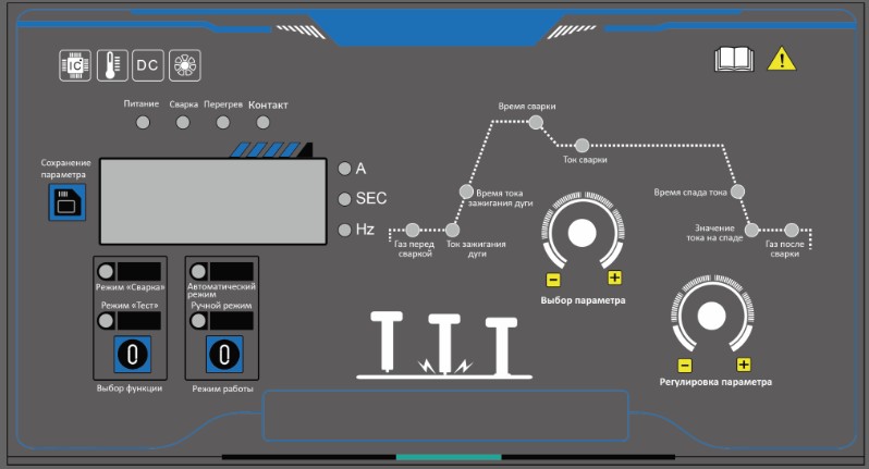 • Автоматизированная настройка. Функция синергетического подбора режимов сварки адаптирует параметры под конкретный материал и размер крепежа, исключая ошибки ручного ввода.